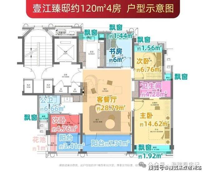 建面约120㎡户型通过6个飘窗、2个南朝阳台(赠送一半面积)及独享约5㎡电梯厅,已成为片区内的价值优选。